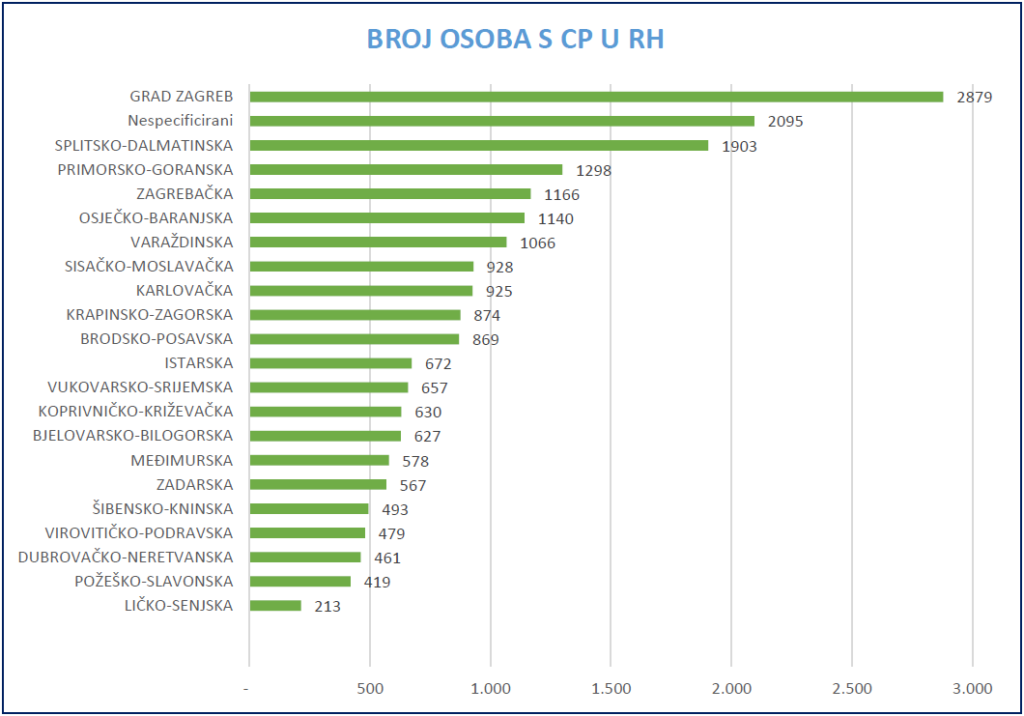 Najveći broj osoba s CP živi u Gradu Zagrebu (2879), zatim na području Splitsko dalmatinske županije (1903), Primorsko goranske županije (1298), Zagrebačke županije (1166), Osječko baranjske županije (1140) i Varaždinske županije (1066). Suprotno tome, najmanji broj osoba s CP živi na području Ličko senjske županije (213), Požeško slavonske županije (419), Dubrovačko neretvanske županije (461), Virovitičko podravske županije (479) i Šibensko kninske županije (493).
