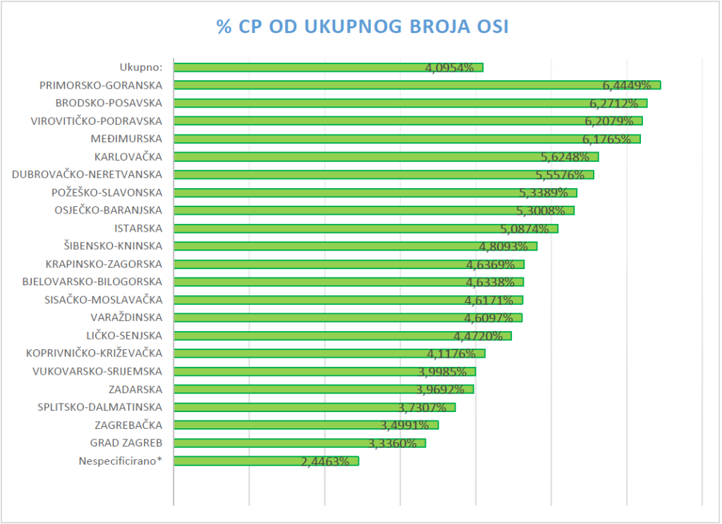 Analizom podataka vezano za udio osoba s CP u odnosu na ukupan broj osoba s invaliditetom u RH uočava se pokazatelj da najveći broj osoba s cerebralnom paralizom živi na području Primorsko goranske županije (6.44%), zatim slijedi Brodsko posavska županije (6.27%), Virovitičko podravska županija (6.20%) i Međimurska županija (6.17%). Najmanji postotak osoba s CP živi na područjima prebivališta koja nisu navedena ili mjestima prebivališta koja nisu u službenom šifrarniku naselja (2.44%), slijedi Grad Zagreb (3.33%), Zagrebačka županija (3.49%), Splitsko dalmatinska županija (3.73%), Zadarska županija (3.96%) i Vukovarsko srijemska županija (3.99%).